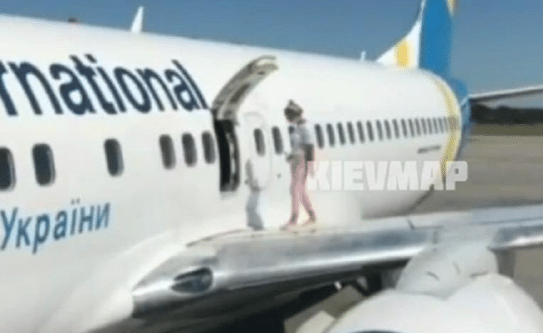У київському аеропорту Бориспіль після посадки авіарейсу пасажирка скористалася аварійним виходом і вийшла на крило літака. Відео інциденту опублікував телеграм-канал KievMap.