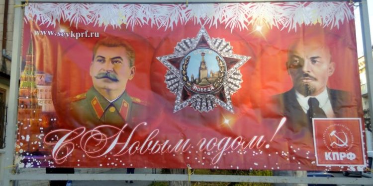 Традицію вивішувати агітаційні плакати та банери в центрі міста ввели комуністи після окупації Криму й Севастополя в 2014 році. На плакатах зображують молодого Леніна, Надію Крупську та Сталіна.