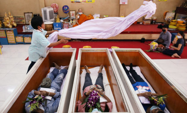 У Таїланді в храмах проводять особливий ритуал — люди влаштовують власні символічні похорони, щоби «почати нове життя» без проблем і стресу. Через пандемію COVID-19 він став ще популярнішим.Щоб «переродитися» таким чином, потрібно заплатити $3,30 за квіти, свічки та спеціальний одяг.