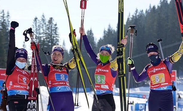 Жіноча збірна України з біатлону завоювала бронзову медаль на чемпіонаті світу. В естафеті українська четвірка у складі Анастасії Меркушиної, Юлії Джими, Дарії Блашко і Олени Підгрушної стала третьою в словенській Поклюці.