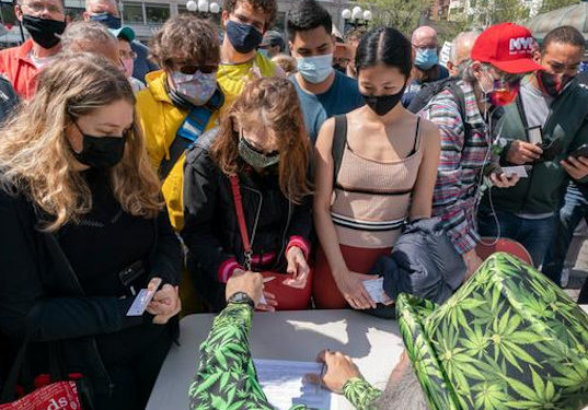 Активісти руху New York Marijuana Justice на Манхеттені пропонували безкоштовно по одній такій самокрутці щепленим від коронавірусу особам. Охочі, які мали надати підтвердження вакцинації у паперовому або електронному вигляді, вишикувалися у довгу чергу.