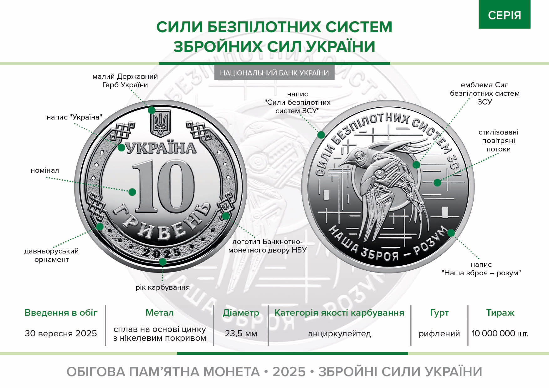 “Ця монета вшановує внесок особового складу Сил безпілотних систем ЗСУ у захист територіальної цілісності України, символізуючи інноваційність, технологічну перевагу та інтелект українського війська”, – кажуть у пресслужбі НБУ.