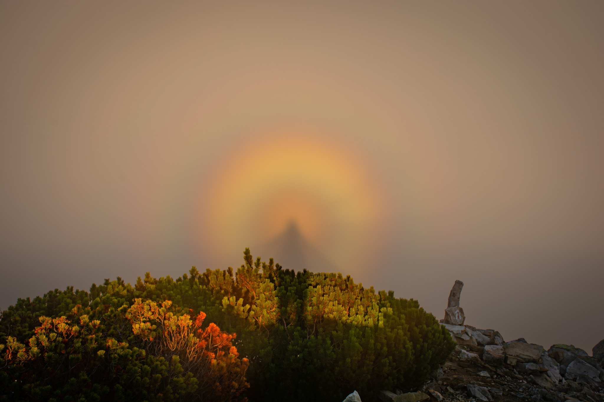 На горі Грофа мандрівнику Ігорю Романіву вдалося зловити рідкісне оптичне явище, яке виникає, коли сонце світить ззаду спостерігача, а тінь проектується на хмари чи туман.