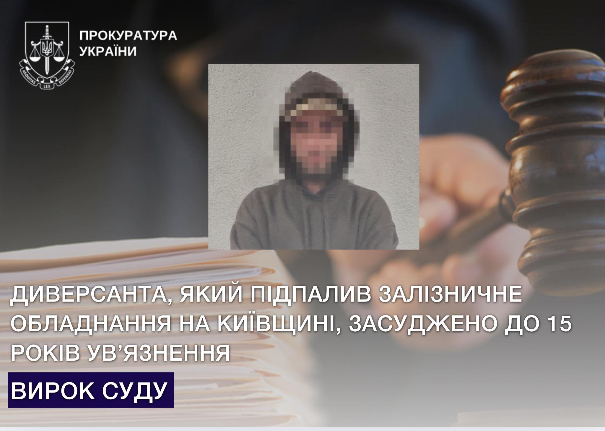 Диверсанта, який підпалив залізничне обладнання на Київщині, засуджено до 15 років ув’язнення. Про це пише Київська обласна прокуратура.