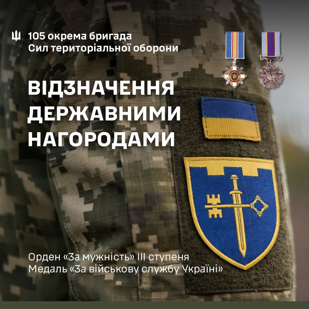 Військовослужбовці 105-ї окремої бригади територіальної оборони ЗСУ, яка сформована на Тернопільщині, отримали високі державні нагороди. Відповідні укази підписав Президент України Володимир Зеленський, відзначаючи особисту мужність, стійкість та самовіддані дії воїнів у захисті державного суверенітету та територіальної цілісності України.