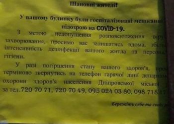 У Дніпрі на будинках, де живуть люди із підозрою на коронавірус, міська влада розвісила оголошення з попередженнями про заражених на ...