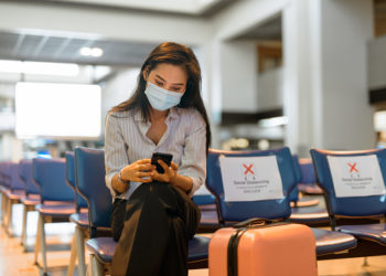 Portrait of young Asian tourist woman with mask for protection from corona virus outbreak social distancing at the airport Великобританія ...